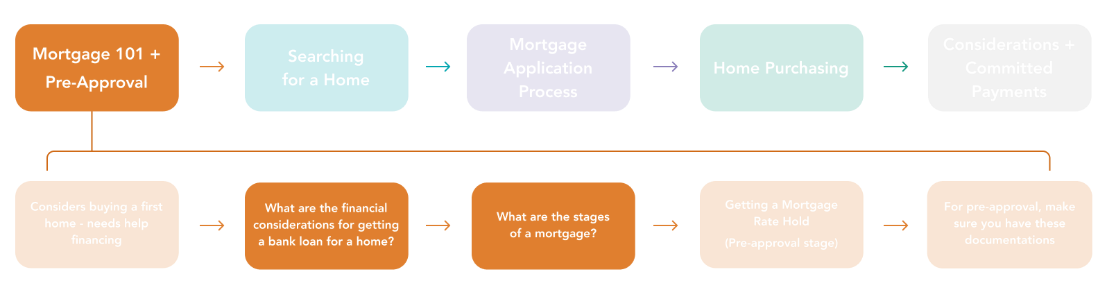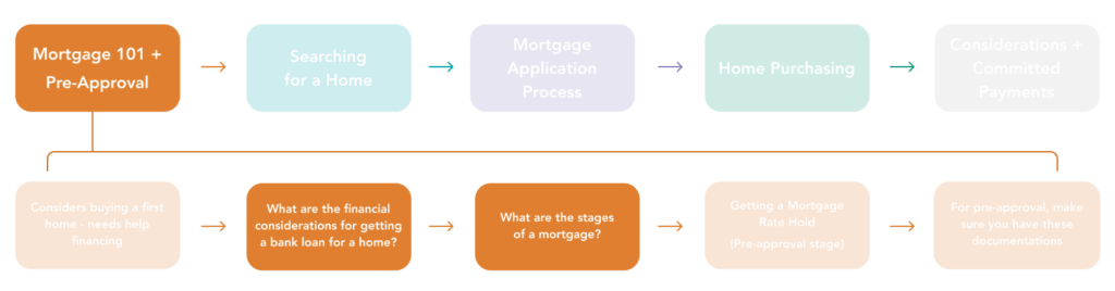 Surfacing essential home financing information through three distinct phases. Presented through familiar patterns with different outcomes including learning, application, and client after-care.