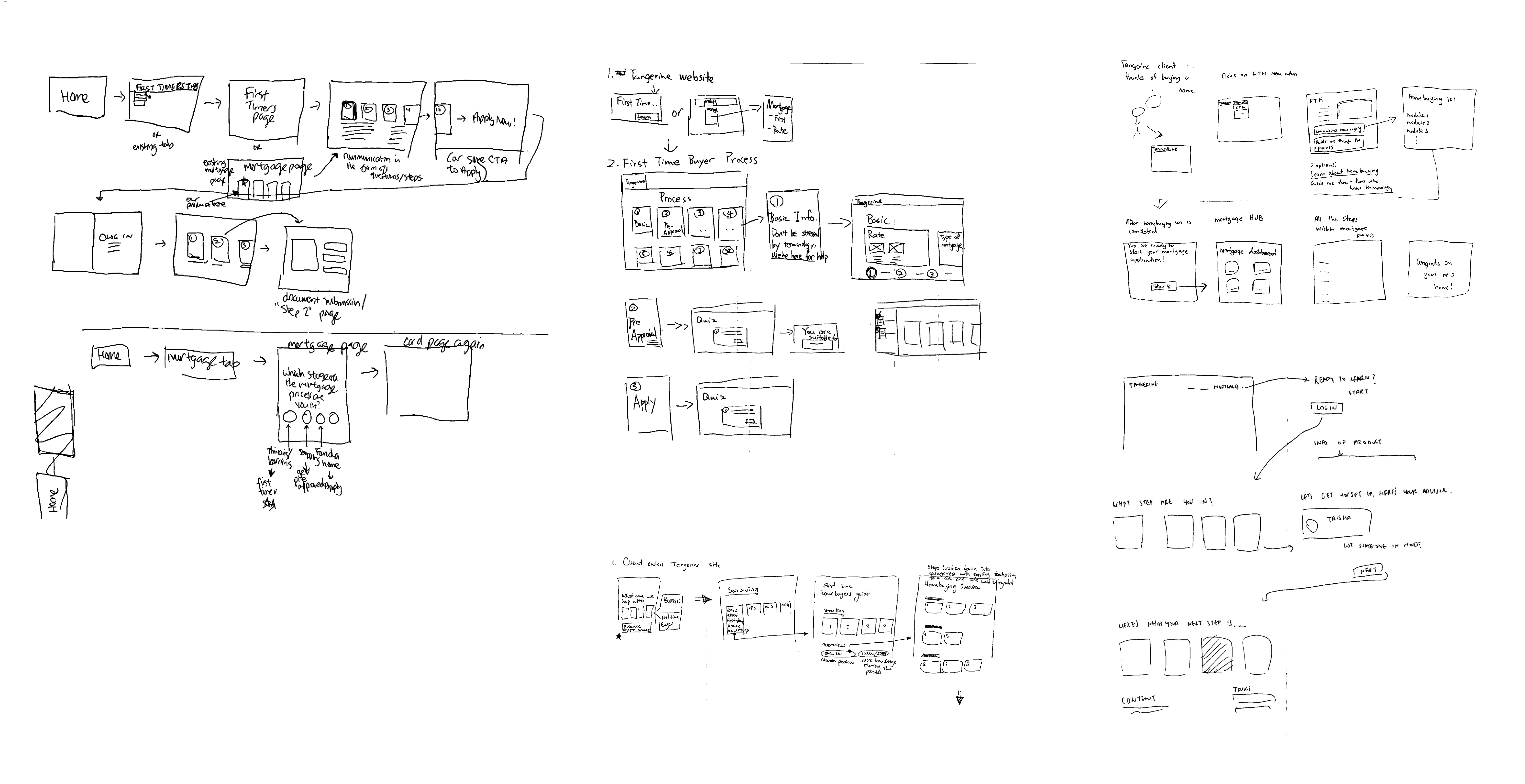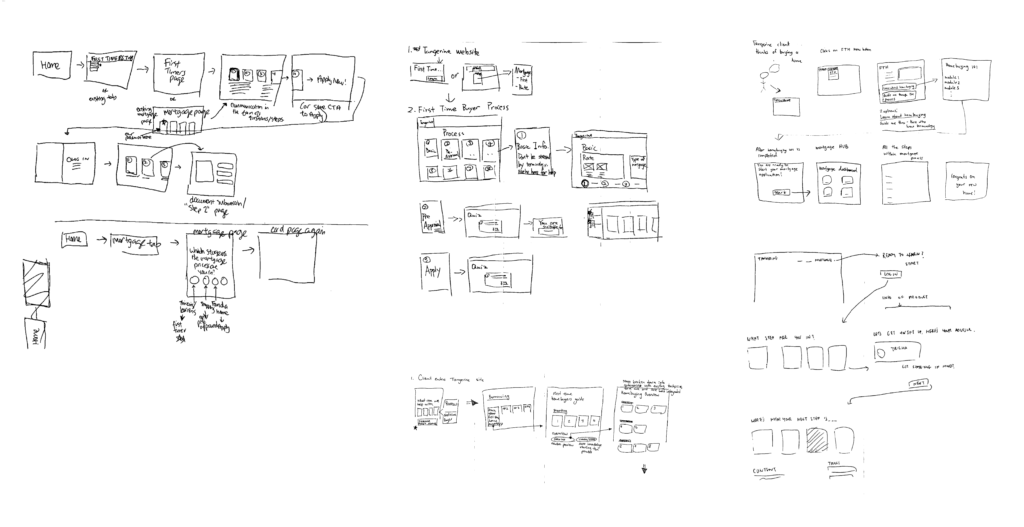 we mapped out how existing Tangerine mortgage clients go through the process to apply for a mortgage. Using data obtained from our research, we found that a lot of the pain points originated from the learning and pre-approval phase. Particularly, the aim of the first design sprint was to tackle the question of what financial considerations should be made before applying for a loan, and what the stages of applying for a mortgage are.