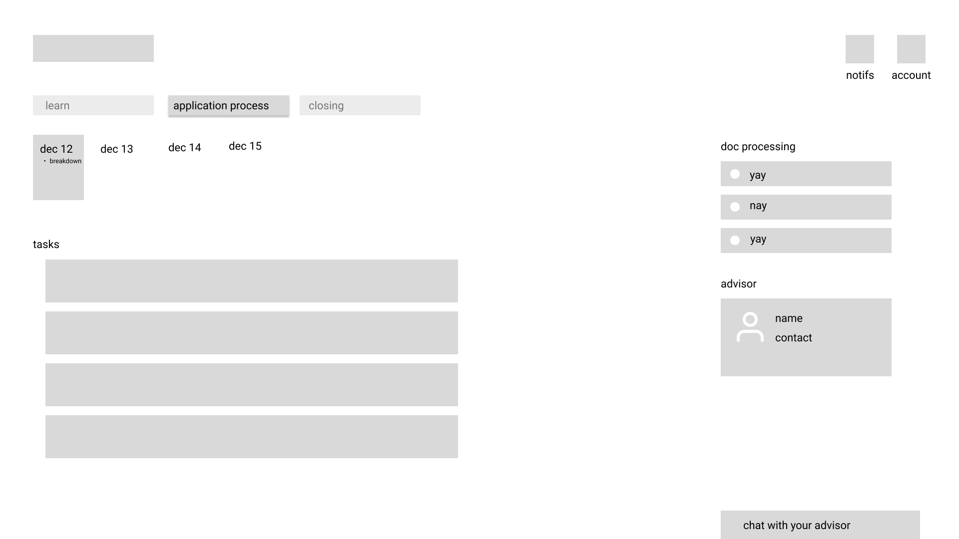 Initial prototype of the platform focused on building the knowledge base for the first-time home-buyer by diving up the entirety of the home-buying process into 10 key steps, as discovered in secondary research. Each step would include a description of that point in the process and provide a list of recommended and required steps to complete.