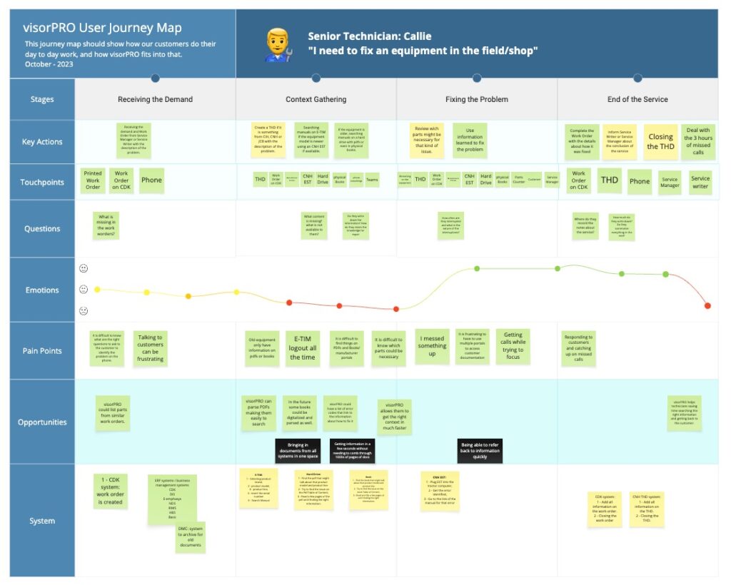 Using the research our team gathered, I mapped out what a day-to-day looked like to a Service Manager, a Senior Technician, and a Junior Technician. We quickly found that the highest points of friction across these roles lay in the area of context gathering. Information was scattered across multiple online portals and miscellaneous PDFs. Even if it were in a better-designed portal, it’s challenging to determine which parts are necessary for the repair.